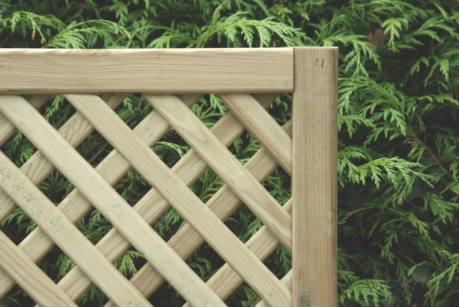 Our green pressure treated softwood decorative privacy trellis, is built into a frame with a flat top and are a perfect feature to any garden. These trellis panels look identical on both sides and provide extra privacy between neighbouring gardens. Supplied through KDM Timber & Forest Products.